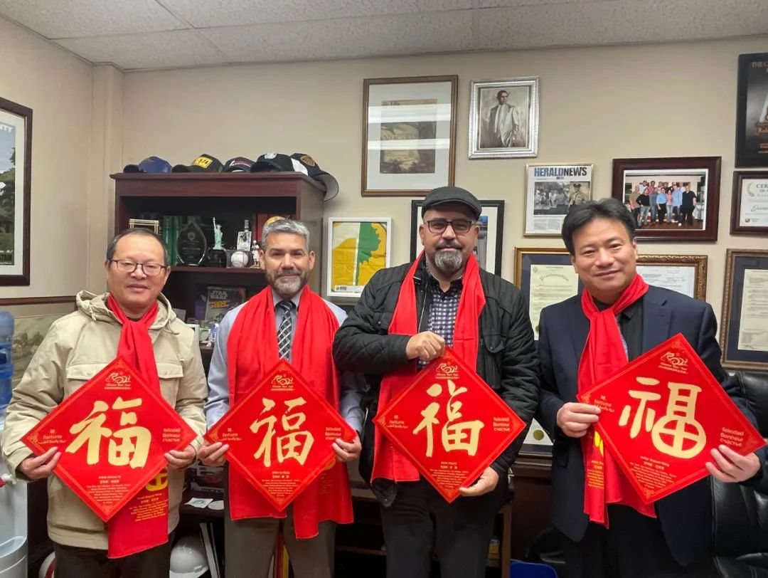 1月23日,中国画学会副秘书长、江苏省中国画学会副会长兼秘书长翟优,江苏省中国画学会常务理事、扬州瘦西湖艺术中心主任董雷一行代表中、美、加艺术家先后走进新泽西州威廉帕特森大学、帕特森市政厅及华人社团送福拜年。