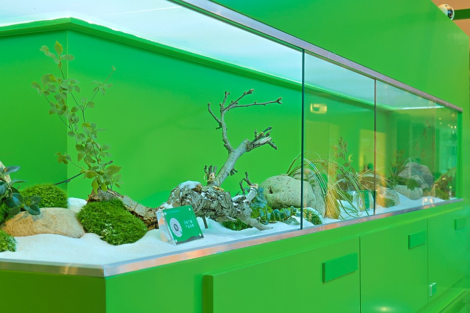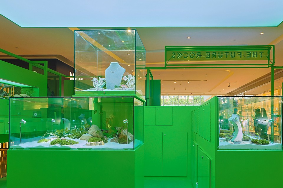曾冠雄介绍,快闪店设计遵循The Future Rocks崇尚自然,关爱地球的环保理念。全场以绿色为基调,撷取树木,绿植,砂石等,在不同的玻璃展示柜内还原原生态的微缩自然景观,璀璨夺目的珠宝陈列其间,闪耀光芒,吸引每一位观看者深入探寻序◆境宝藏。