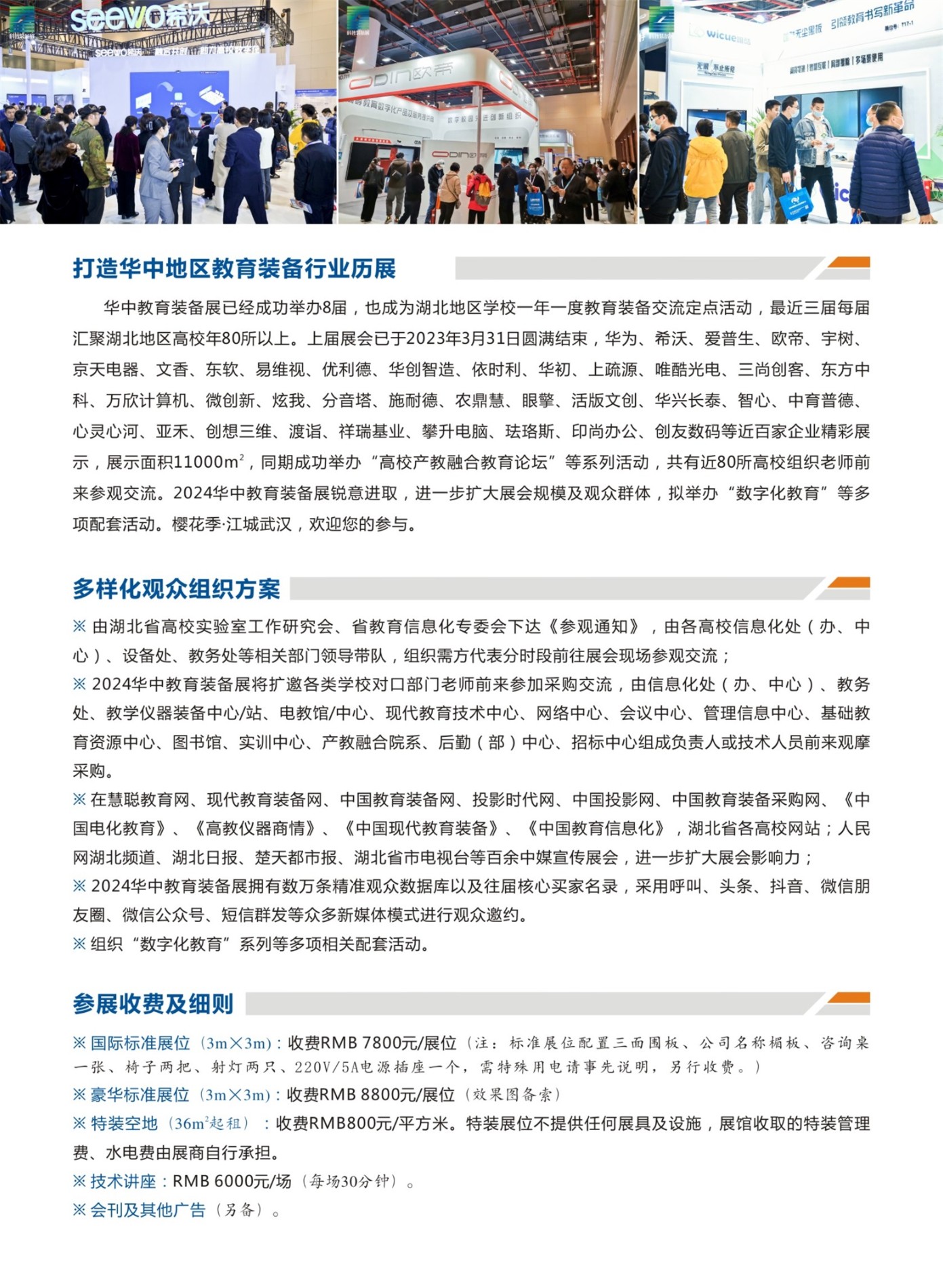 华中教育装备展已经成功举办8届,也成为湖北地区学校一年一度教育装备交流定点活动,最近三届每届汇聚湖北地区高校年80所以上。上届展会已于2023年3月31日圆满结束,华为、希沃、爱普生、欧帝、宇树、京天电器、文香、华初、上疏源、东软、易维视、优利德、华创智造、依时利、唯酷光电、三尚创客、东方中科、万欣计算机、微创新、炫我、分音塔、施耐德、农鼎慧、眼擎、活版文创、华兴长泰、智心、中育普德、心灵心河、亚禾、创想三维、渡诣、祥瑞基业、攀升电脑、珐珞斯、印尚办公、创友数码等近百家企业精彩展示,展示面积11000㎡,同期成功举办“高校产教融合教育论坛”等系列活动,共有近80所高校组织老师前来交流。2024华中教育装备展锐意进取,将进一步扩大展会规模及观众群体,拟举办“数字化教育”等系列配套活动。樱花季·江城武汉,欢迎您的参与。